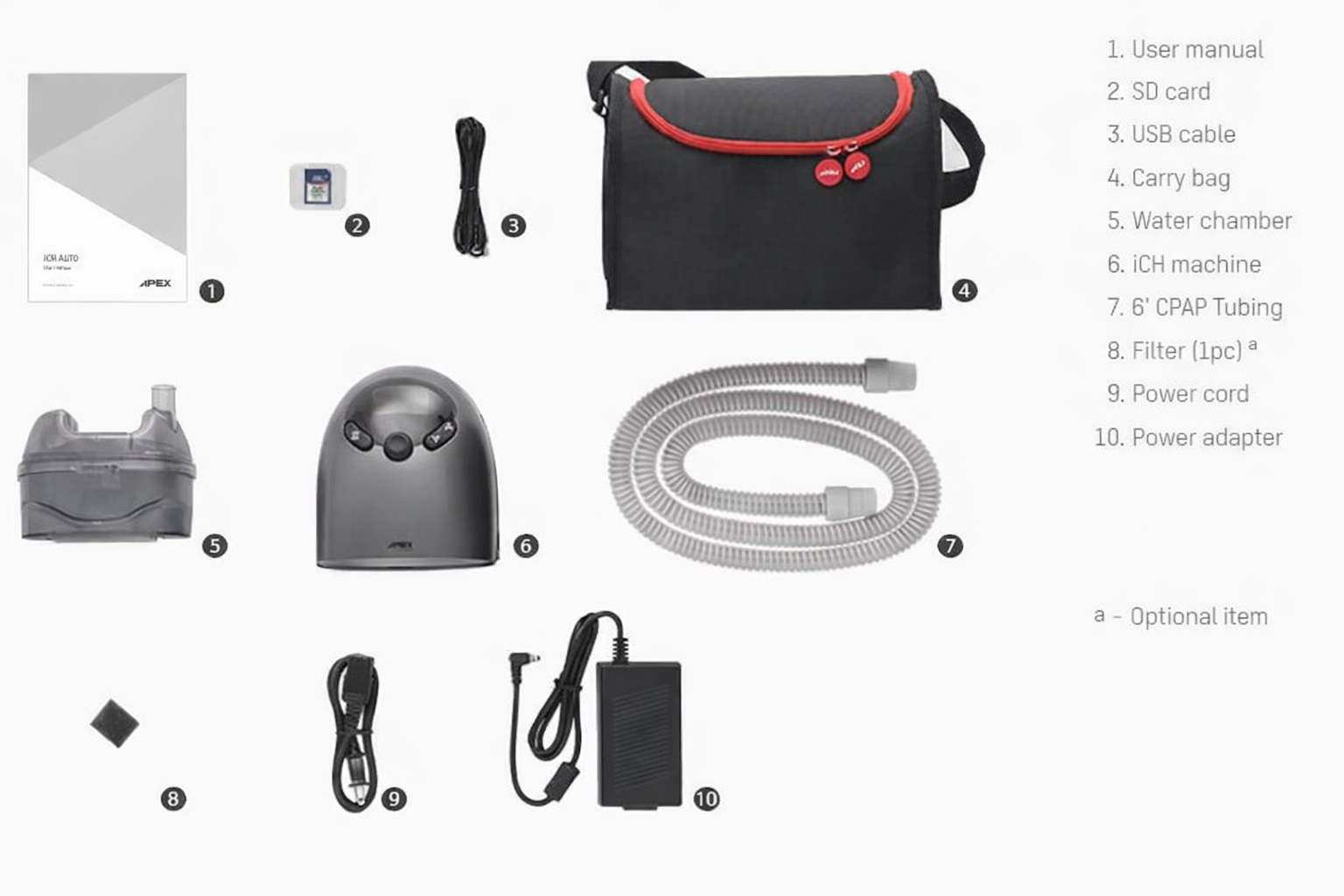 A complete sleep apnea solution that includes a Flagship Model AutoCPAP Machine, Integrated Humidifier, Australian spec. Power Supply, Tubing, SD Card, Travel Case, Spare Filter etc.